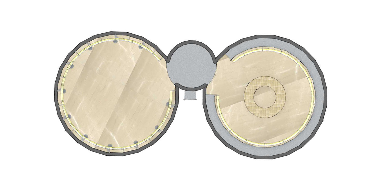 A series of intersecting cylindrical rooms form a backdrop for bespoke stainless steel fixtures. Circular tub lights complement flared mosaic walls. Custom shower heads integrate with the lighting system. Clear sight lines, and open concept space planning - taken potentially to an extreme- force users into a state of accountability, removing potential for untoward activity, fostering a safe, inclusive space.